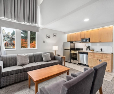 Located just steps from the gondolas, restaurants, and shopping, this deluxe studio suite at Whistler Peak Lodge offers the perfect mountain getaway in the heart of Whistler Village. Comfortably sleeping four, it features a queen bed and a double Murphy bed, plus a cozy gas fireplace for winter and air conditioning for summer. The full […]