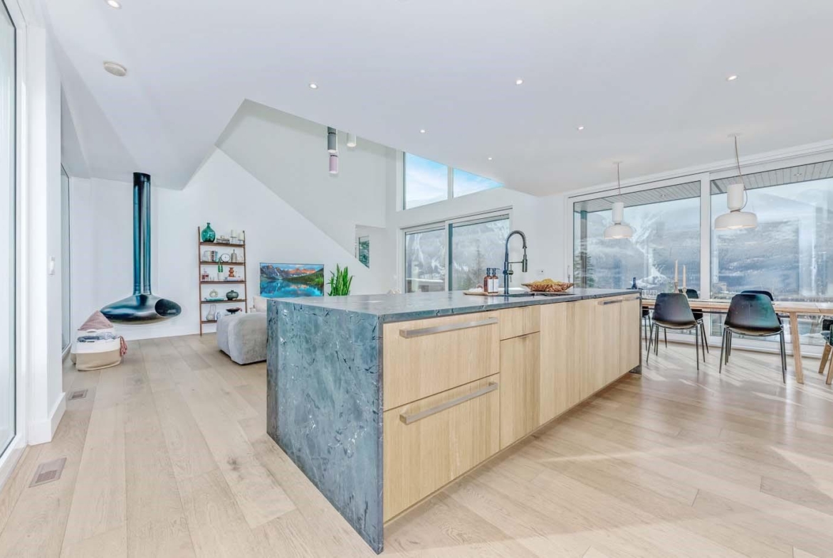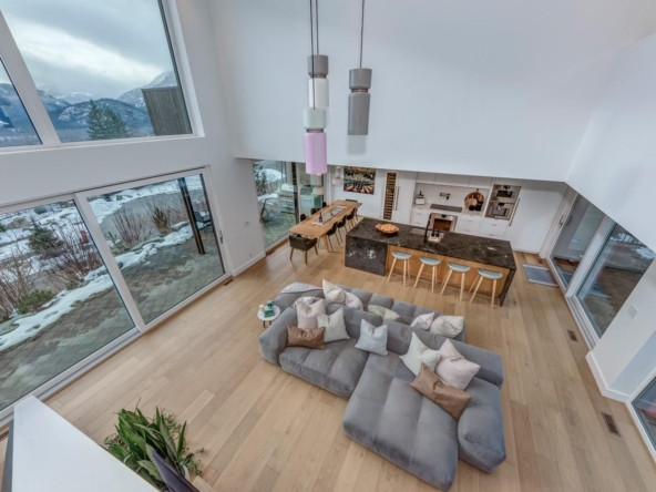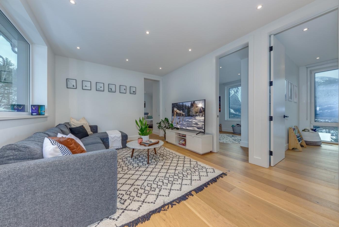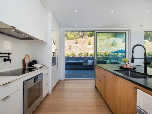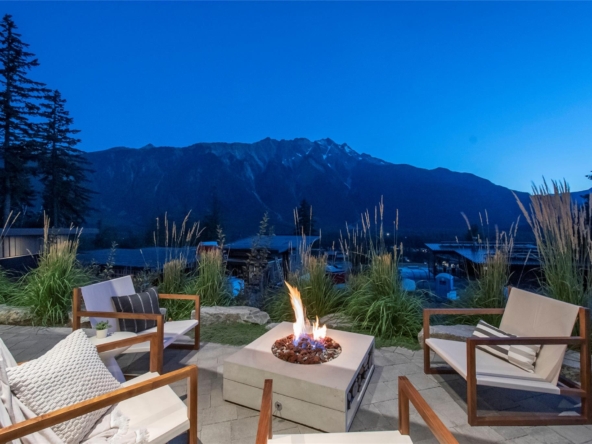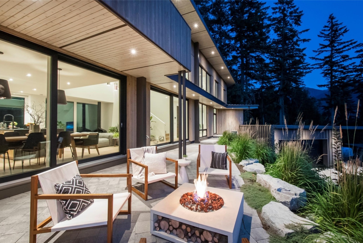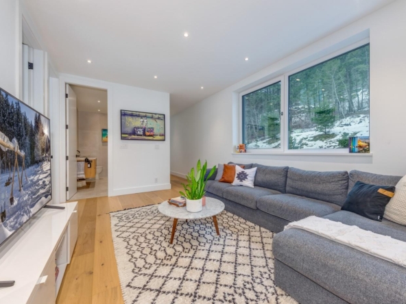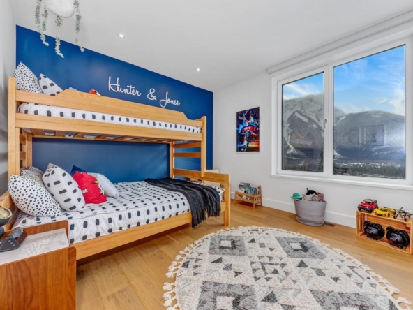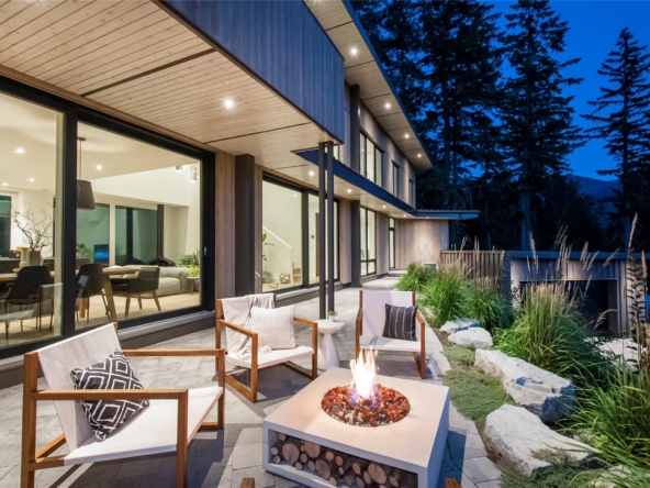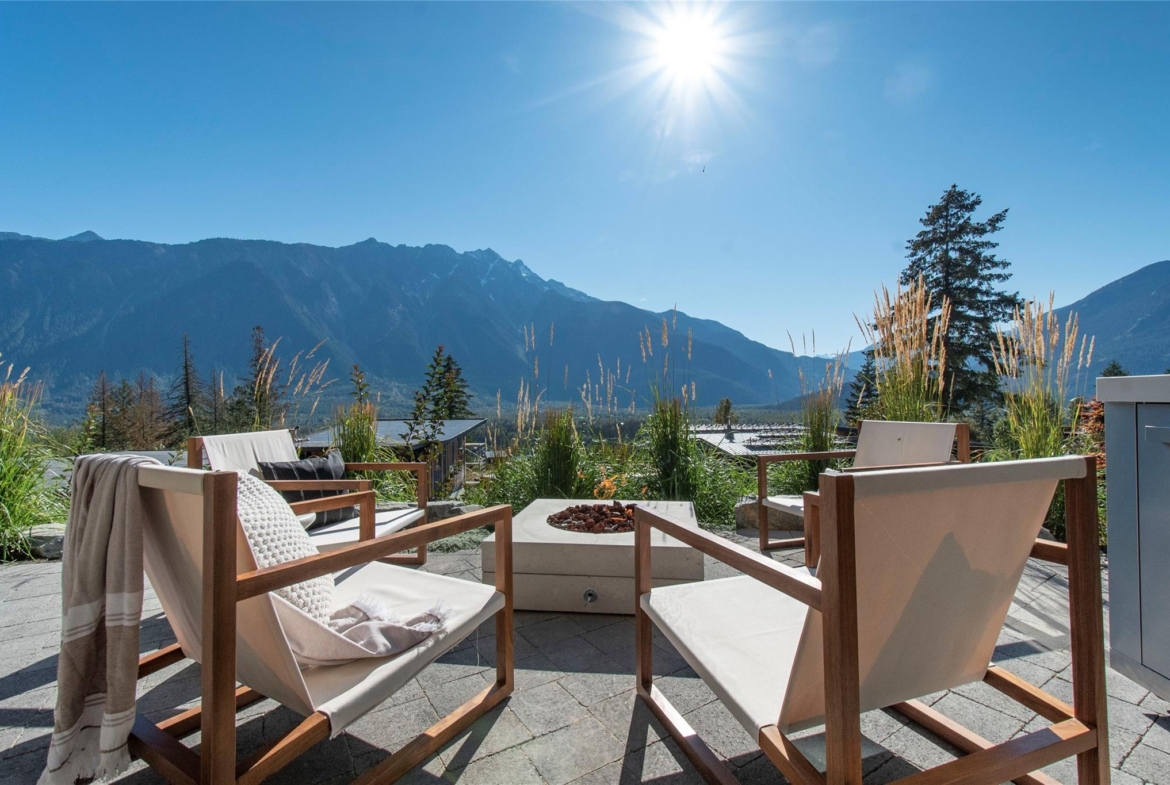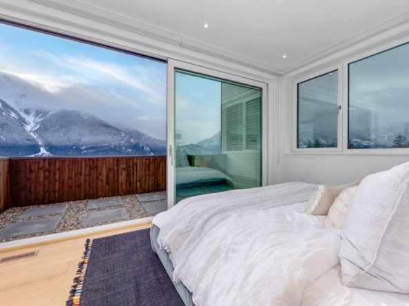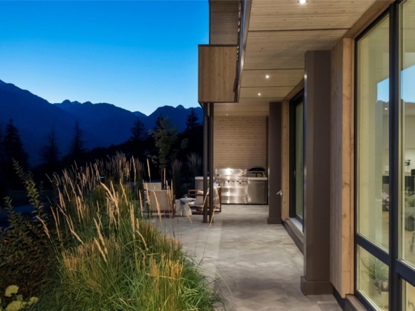 and the Pemberton Valley, this residence offers 4 bedrooms, 3.5 baths, a media room, kids’ lounge, gym, and home office. Every corner has been thoughtfully curated for effortless mountain living—full ICF construction to the roof (energy efficient, durable, soundproof), triple-pane Innotech windows and doors, plug-and-play functionality, and natural materials harmonize beautifully with the surrounding forest and mountain backdrop. Craftsmanship shines in custom millwork, white oak hardwood floors, and premium Gaggenau, Sub-Zero, and Thermador appliances. The kitchen is a chef’s dream, anchored by a striking granite waterfall countertop, built-in wine fridge, and expansive windows and sliding doors that fill the open-plan living area with abundant light beneath soaring vaulted ceilings. Cozy up by the Fire-Orb suspended ethanol fireplace on a snowy winter day, blending practicality with elegance and creating a true statement space for entertaining. Comfort meets performance with a backup generator and high-efficiency heat pump. The low maintenance, non-combustible exterior ensures lasting durability. The garage is an adventurer’s delight, providing an organized space and gear room for all your favorite mountain toys—grab and go in no time, because after all, there’s no time to waste when adventure awaits. Outdoors, the front BBQ and stone fireplace invite seamless