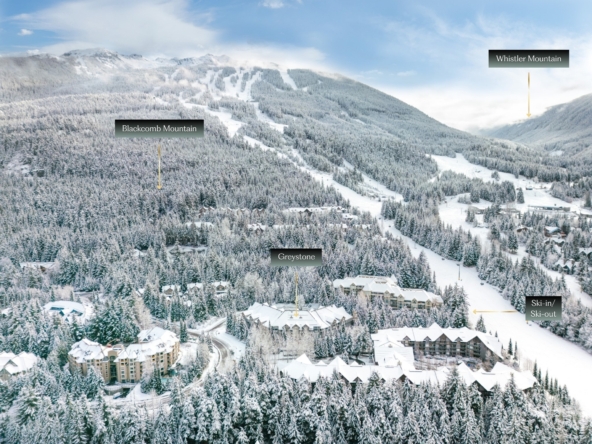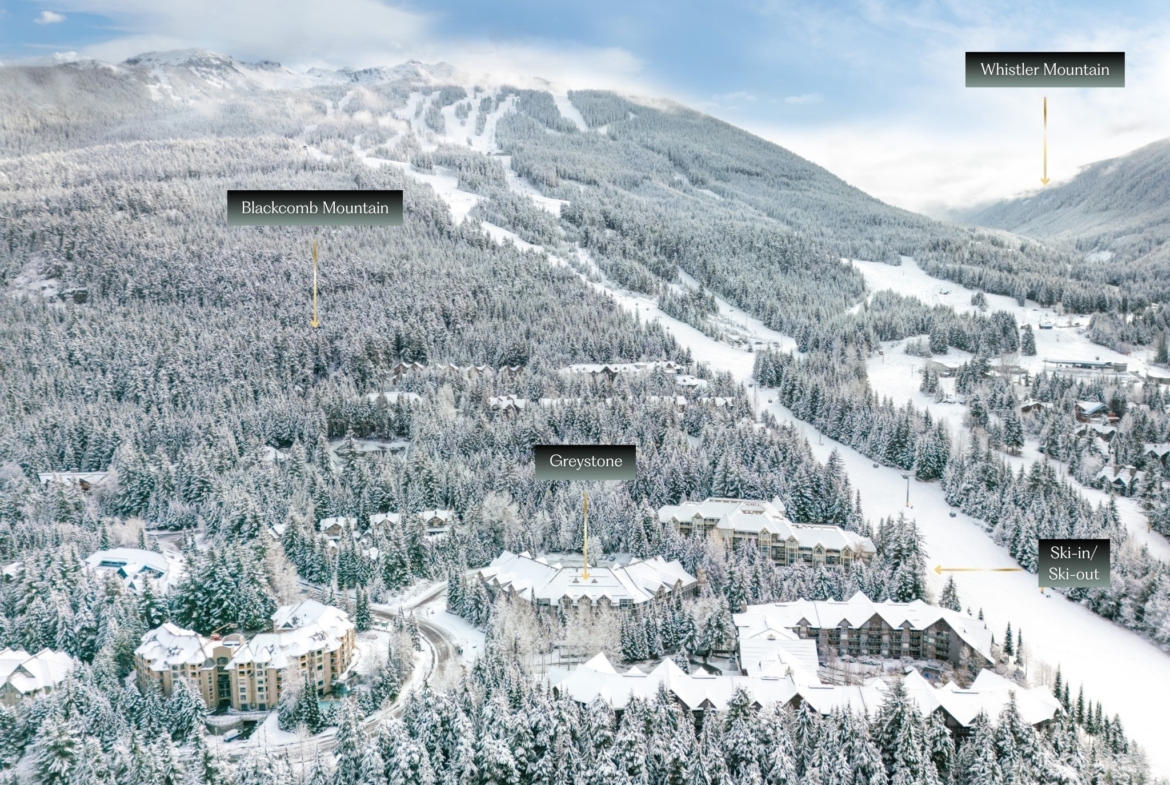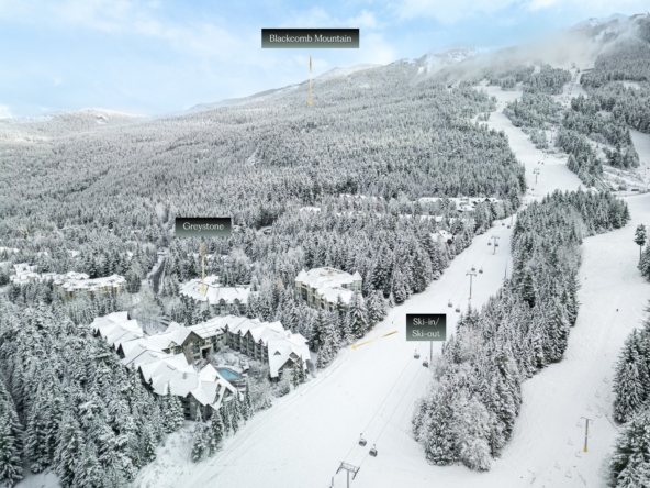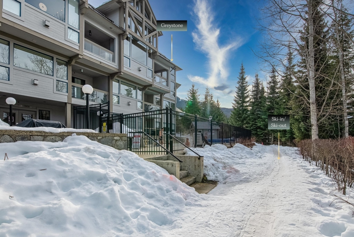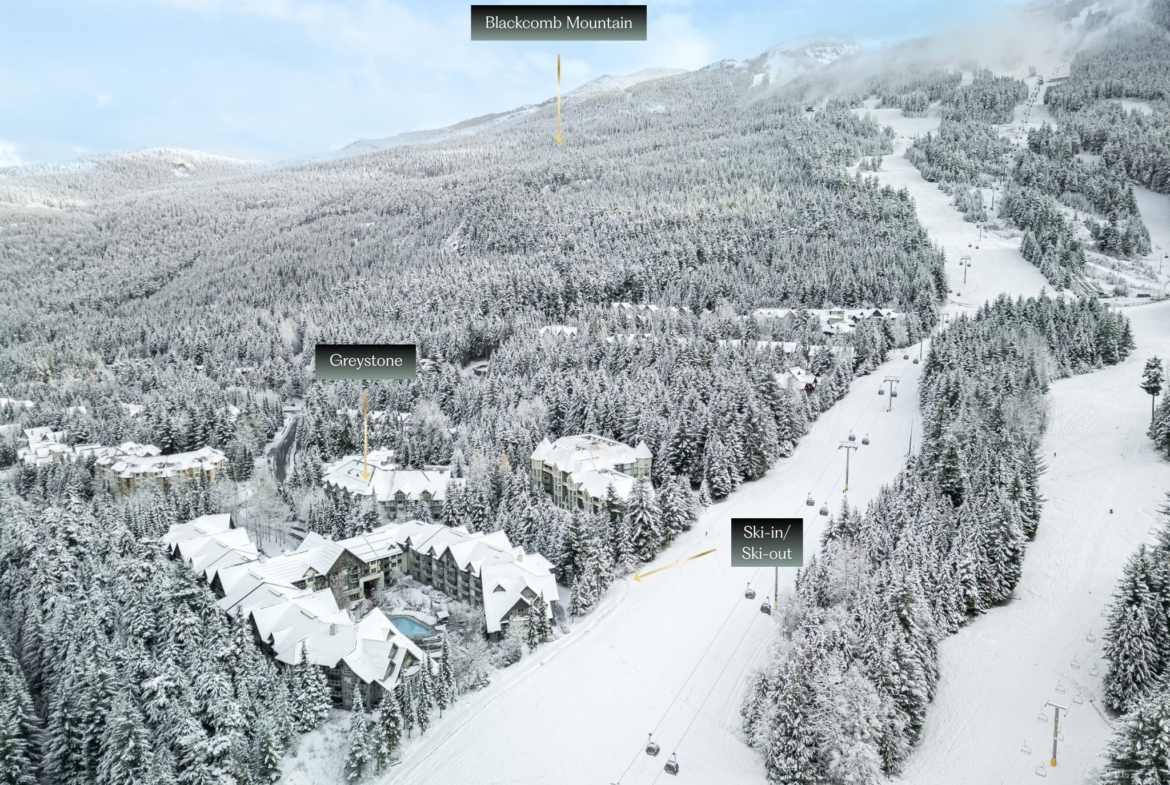 World-class ski-in/ski-out condo at Greystone Lodge, perfectly situated on the slopes of Blackcomb Mountain in a quiet cul-de-sac. Ideally located within the complex, this unit offers exceptional convenience with enhanced soundproofing that eliminates lobby noise, easy access to the front entrance, and a private, SE-facing patio that opens directly onto the lawn—perfect for savouring your morning coffee while basking in sunshine and the serene surroundings. Then, simply step outside to ski or bike directly into Whistler’s world-renowned terrain. This rare, spacious 1-bed, 2-bath unit boasts one of the largest square footages in the area and comfortably accommodates up to 6 guests, offering an ideal setting for families, friends, or renters. The bedroom can be locked off from the main living space for added privacy. After a day on the mountains, relax by the cozy gas fireplace before heading to Fairmont’s Mallard Lounge, RMU, HandleBar, and other local favourite après spots. Phase 1 zoning allows unlimited owner use and nightly rentals/Airbnb with no foreign buyer restrictions. Whether you’re seeking a personal retreat or a lucrative investment, this property ticks all the boxes. Its size, layout, and prime location make it an excellent investment opportunity with high revenue potential. Enjoy year-round amenities in Greystone Lodge, including a heated outdoor pool, 2 hot tubs, BBQs, ski locker, bike storage, and underground parking. Offering unmatched convenience in a four-season paradise, this property is just steps from both Upper and Whistler Villages, placing you at the heart of everything Whistler has to offer. Enjoy easy access to a wide array of amenities, from boutique shops and restaurants to gondolas and chairlifts for skiing, biking, and hiking, as well as the valley trail, Fairmont Chateau Golf Course, and picturesque lakes. Greystone is highly sought-after for its peaceful atmosphere, excellent management, and satisfied owners. Turnkey ready!
