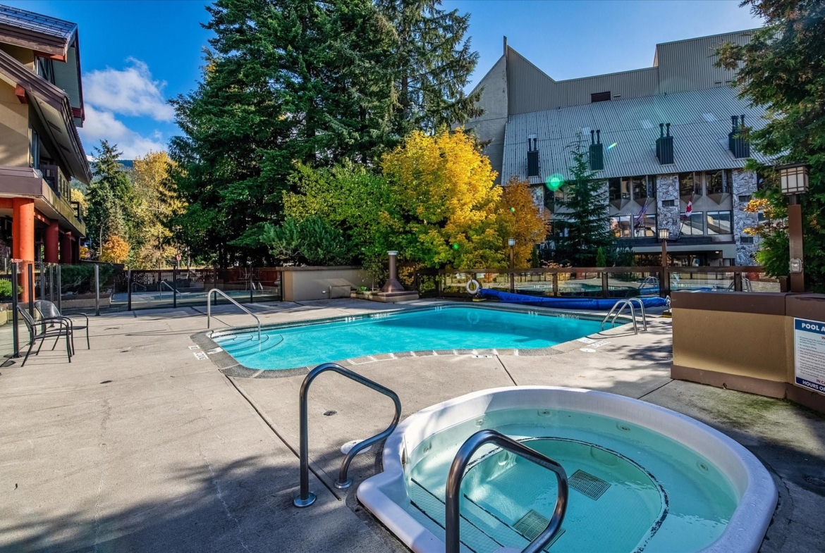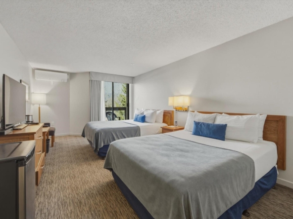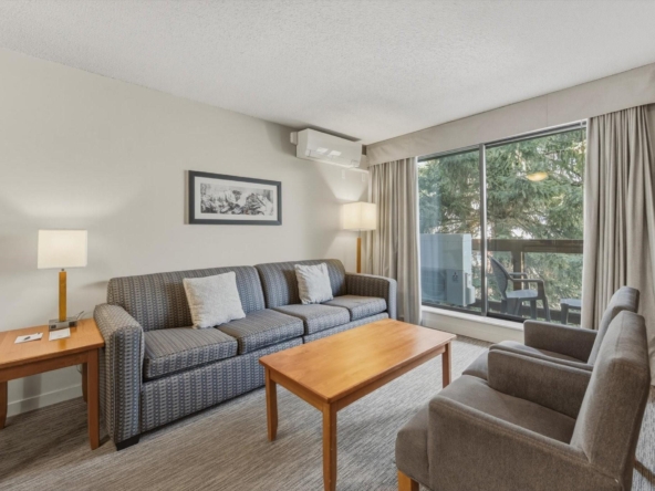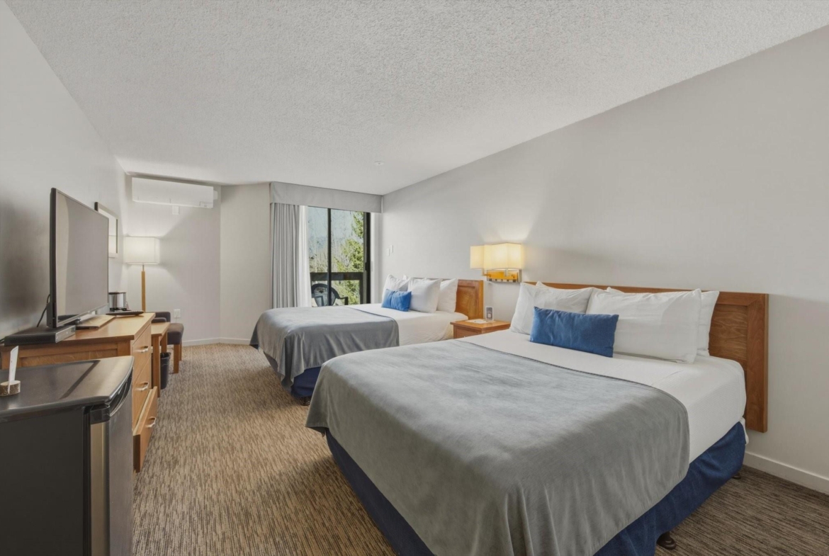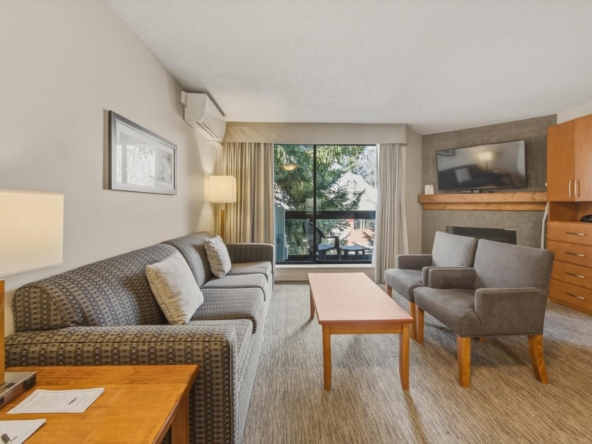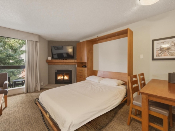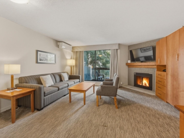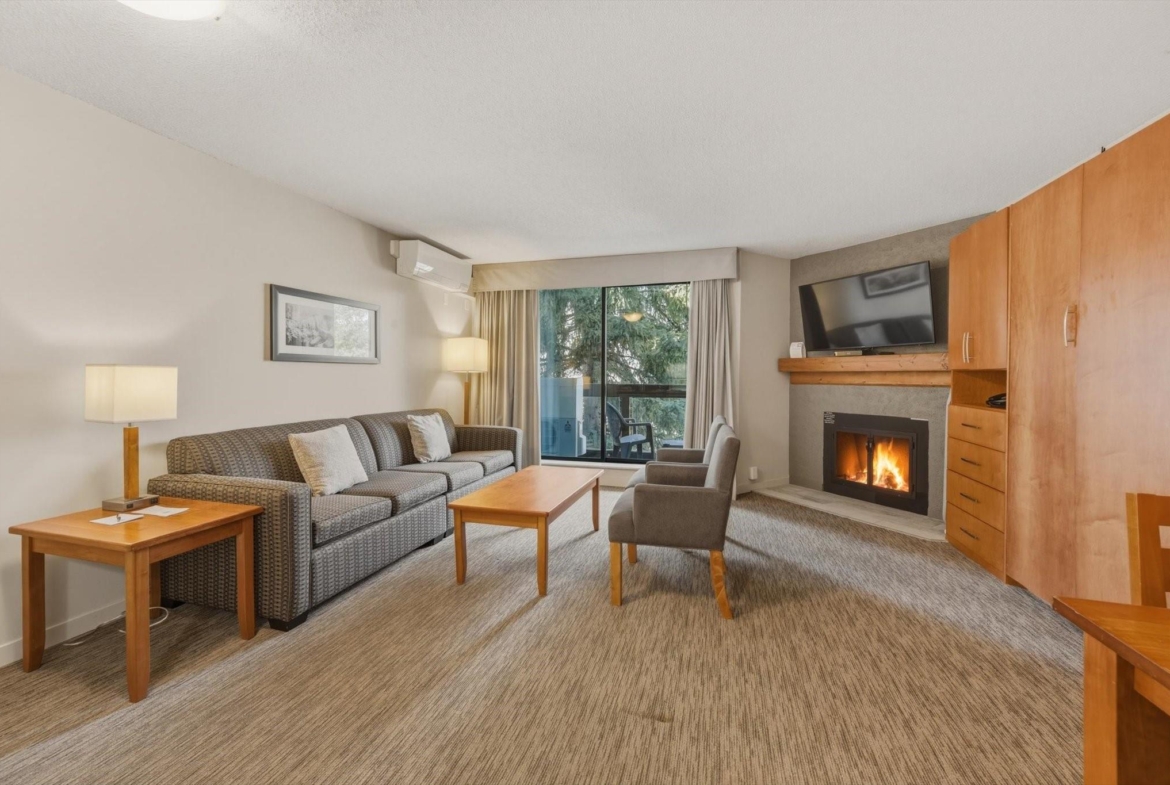 Welcome to Units 254-2 and 254-3 at the Whistler Village Inn and Suites. This 734 sq. ft. lock-off suite offers a practical blend of personal use and revenue generation, located right in the center of Whistler Village. Park in the secure underground lot and enjoy a short walk to the ski lifts, restaurants, and local amenities. The floor plan maximizes rental flexibility. Side A functions as a traditional hotel room featuring two Queen beds, a full bathroom, and a private balcony. The adjoining Side B offers the comforts of a suite with a fully equipped kitchen, dining area, fireplace, Murphy bed, pull-out couch, a second full bathroom, and its own private balcony. Building amenities include a heated pool and hot tub. Zoned Phase 2, the covenant allows for up to 56 days of personal owner use each year. This is a highly hands-off investment: the professional onsite management team handles all nightly rentals, and your Tourism Whistler (TW) fees are paid directly out of the gross revenue. Fully furnished and turnkey.