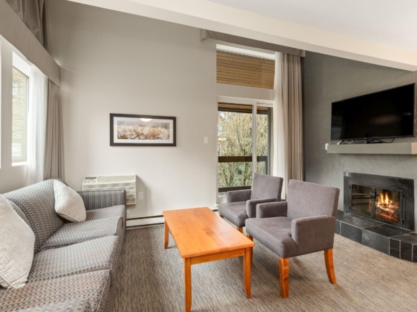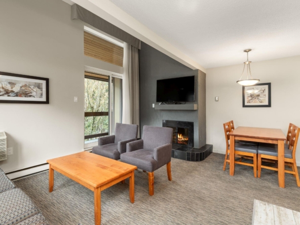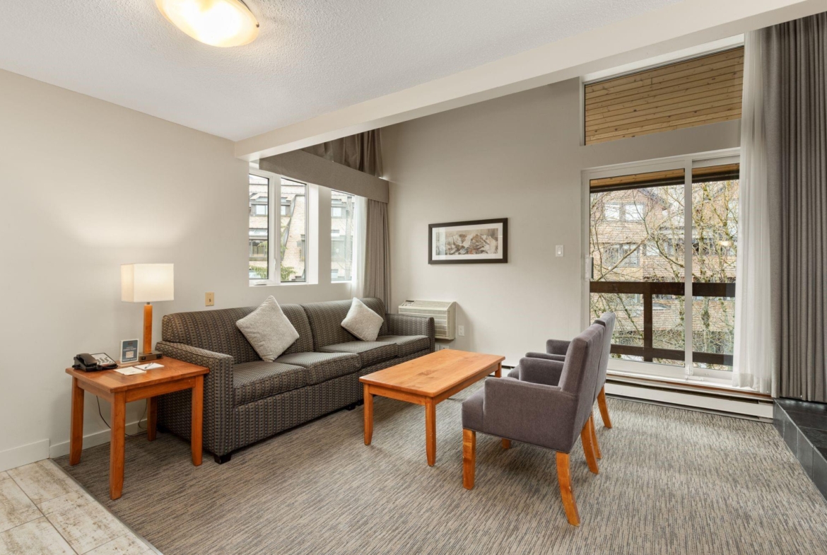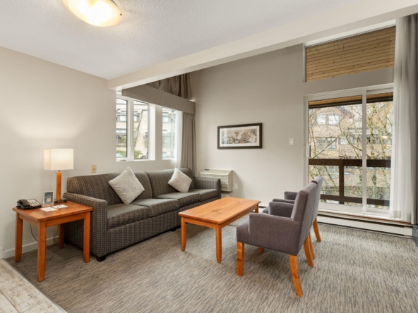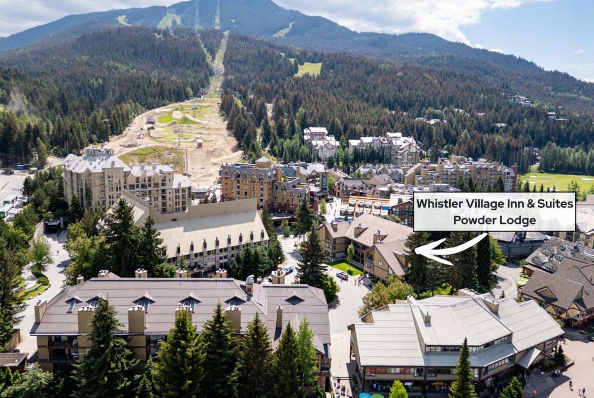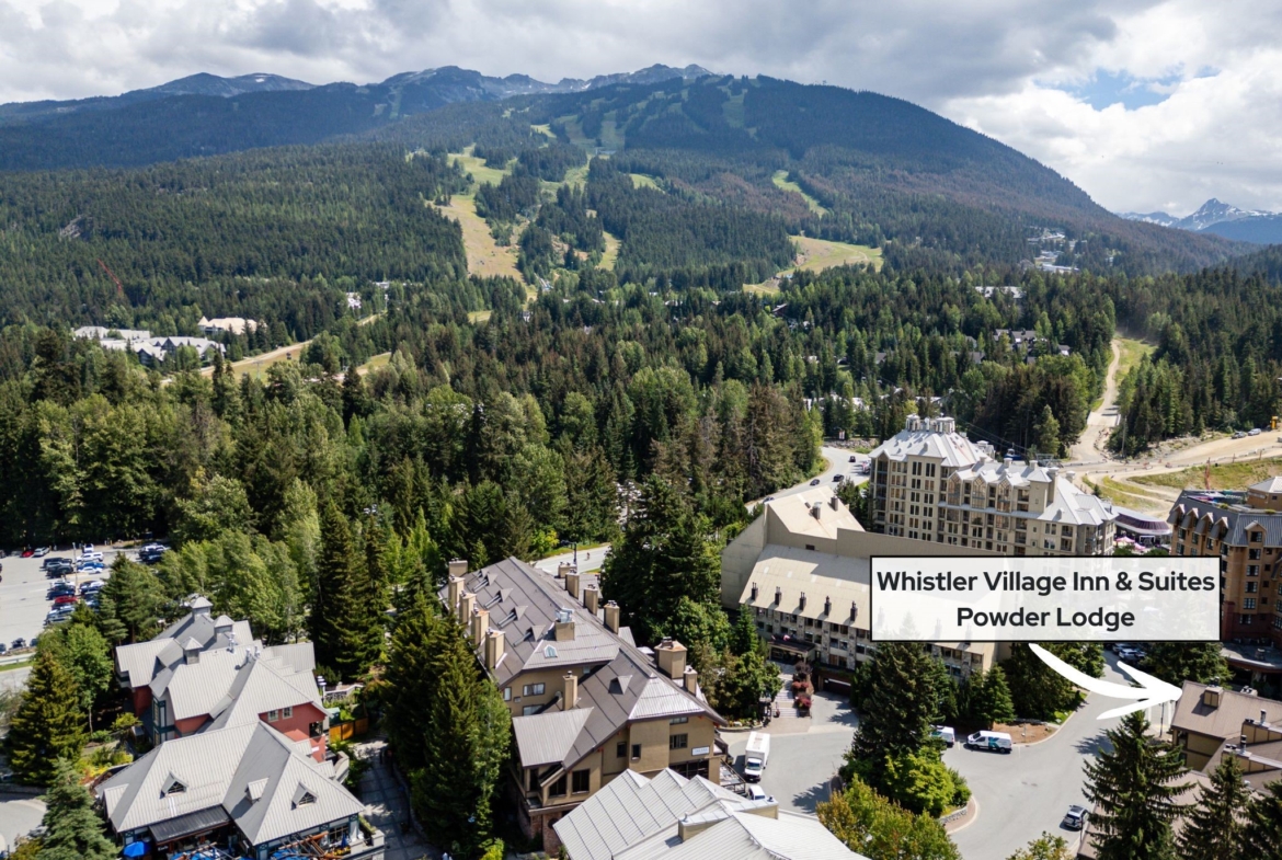 Whistler Village Inn & Suites, Powder Lodge. This bright corner studio features a welcoming living area, peeks of the mountains, and a lofted sleeping area. Steps from the base of Whistler Mountain and the gondolas. This is one of the best value entry points into the Whistler market you will find at this location. As a Phase 2 property, owners enjoy up to 28 days of personal use in summer and winter, while hotel-managed rentals generate revenue the rest of the year. Amenities include a year-round outdoor pool, hot tubs, sauna, fitness room, underground parking, and front desk service.