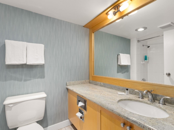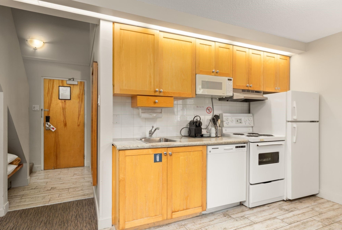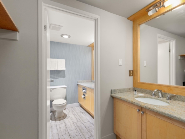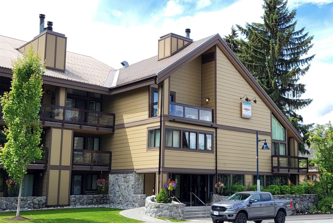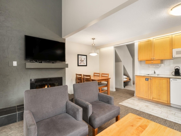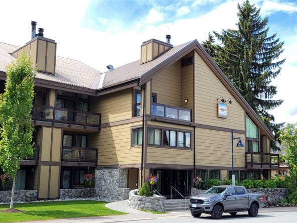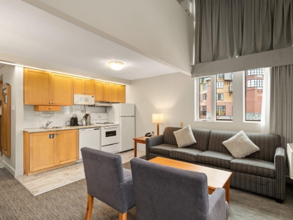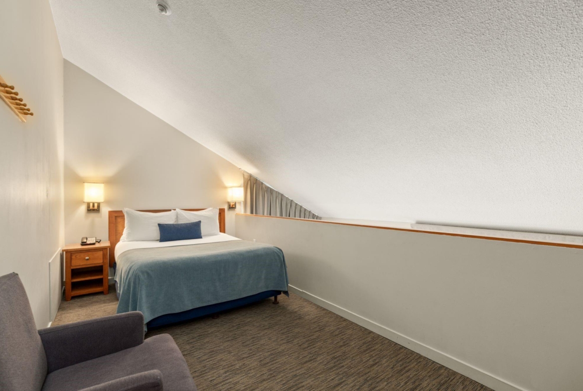 Whistler Village Inn & Suites, Powder Lodge. This bright corner studio features a welcoming living area, peeks of the mountains, and a lofted sleeping area. Steps from the base of Whistler Mountain and the gondolas. This is one of the best value entry points into the Whistler market you will find at this location. As a Phase 2 property, owners enjoy up to 28 days of personal use in summer and winter, while hotel-managed rentals generate revenue the rest of the year. Amenities include a year-round outdoor pool, hot tubs, sauna, fitness room, underground parking, and front desk service.