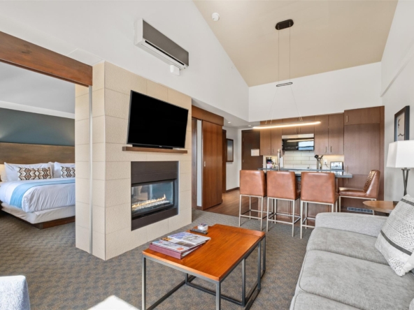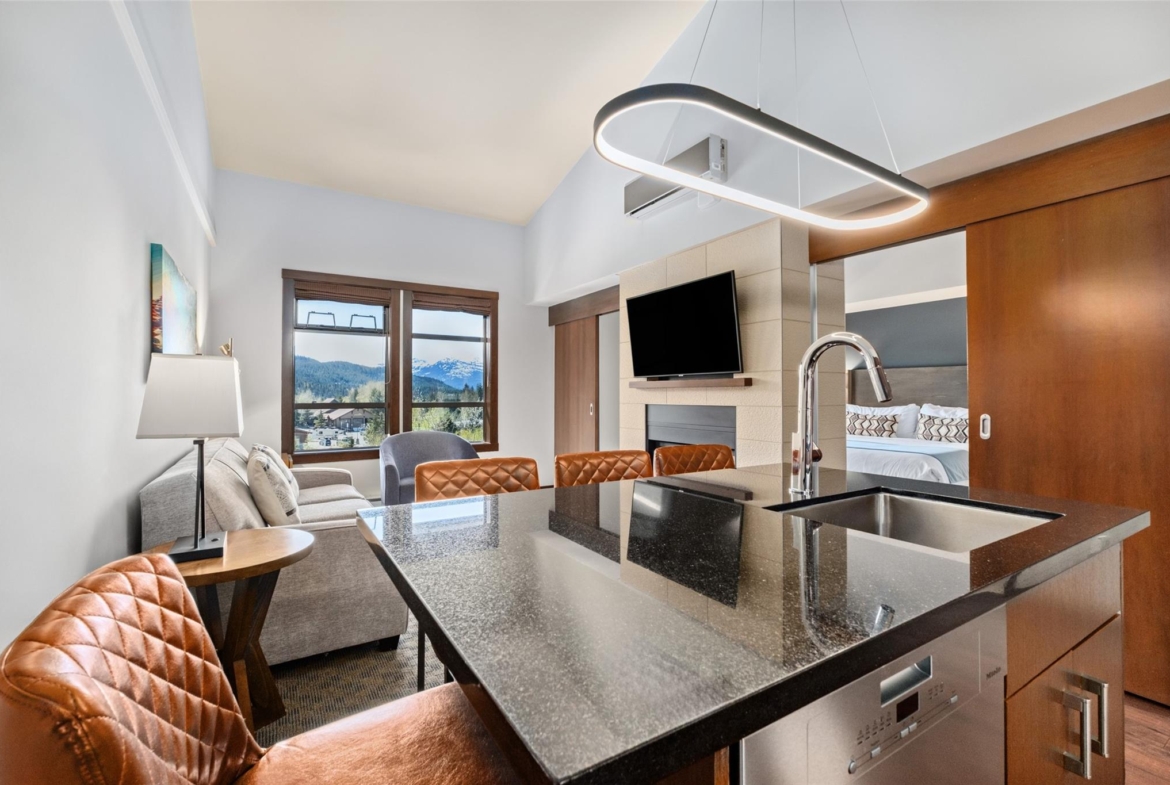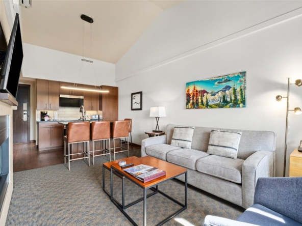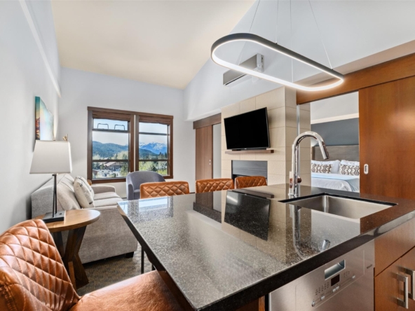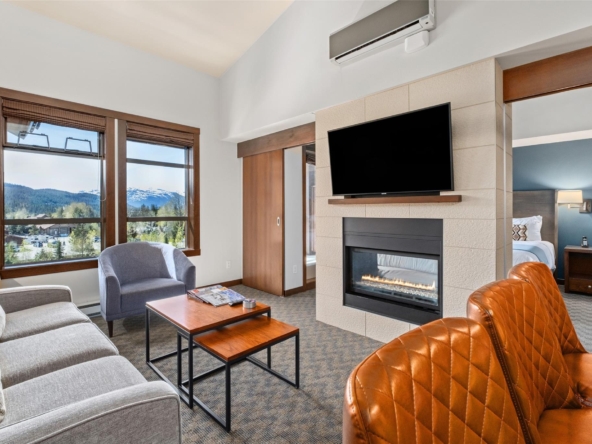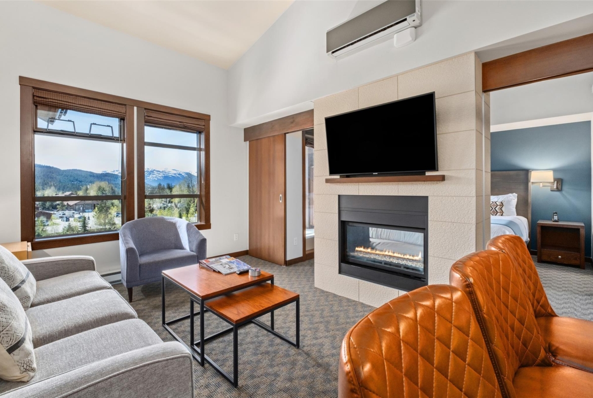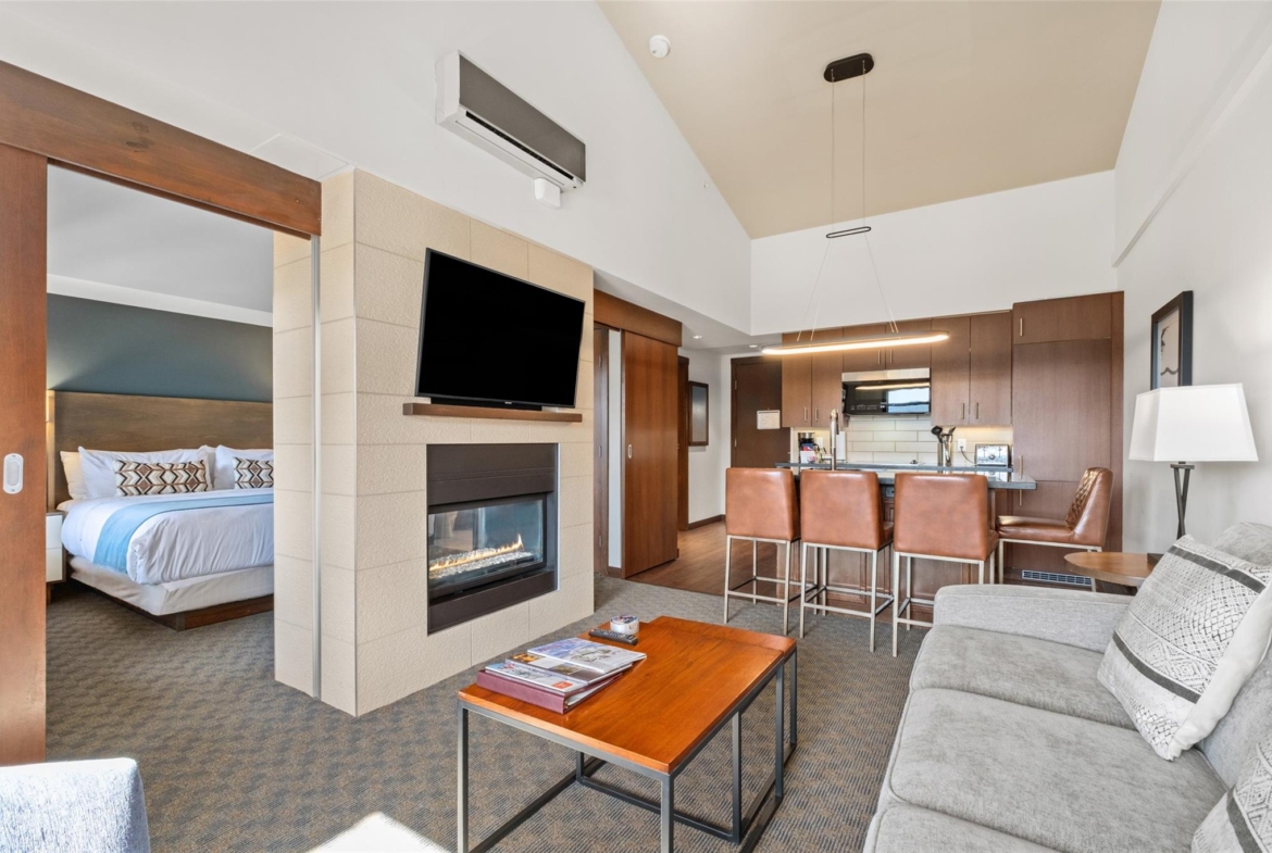 Perfectly positioned at the base of Whistler, this pet-friendly, ski-in/ski-out quartershare places you steps from the Creekside Gondola base. Enjoy one week per month to escape, unwind, or generate revenue through the in-house rental program. Set on the top floor on the sunny, south-facing side of the building, this residence feels bright and open. Vaulted ceilings elevate the space, while a double-sided gas fireplace creates a warm, inviting atmosphere you can enjoy from both the living room and the bedroom. The open-concept layout is designed for gathering and relaxing with a fully equipped kitchen featuring high-end appliances, and space to sleep up to four. Step out onto your private balcony to take in views of Whistler Peak and the vibrant Creekside Village. Evolution’s resort-style amenities invite you to unwind and recharge, from the heated outdoor pool and hot tubs to the sauna, steam room, fitness centre, entertainment spaces, and more.