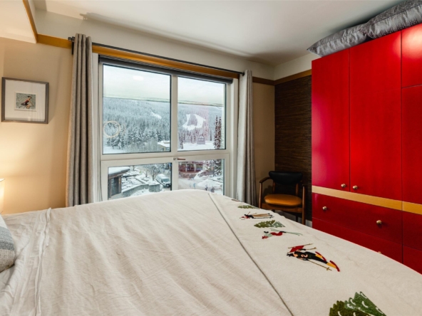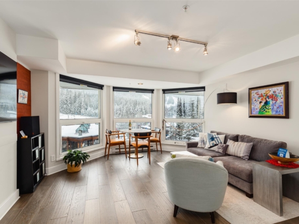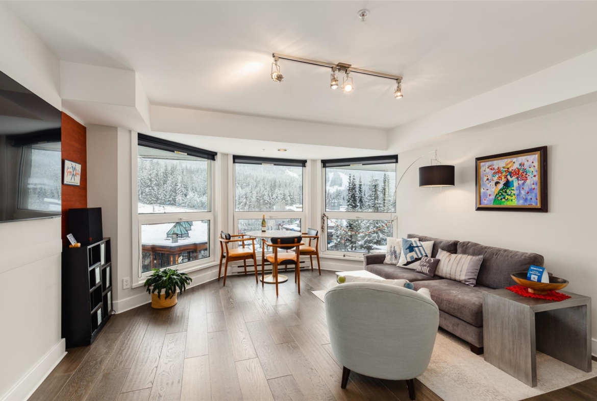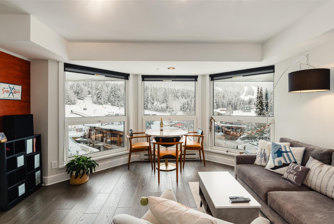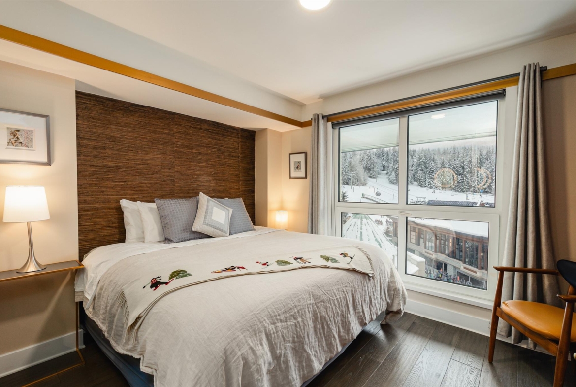 Perfectly located at the base of Blackcomb Mountain, this luxurious ski-in/ski-out residence offers direct, unobstructed views of the mountains, gondola, and Upper Village stroll from every window. A rare one-bedroom with private laundry, it features full, symmetrical living room windows which add balance and light – an uncommon detail in the building. Situated on the coveted 4th level, the highest and most sought-after floor for smaller units, this beautifully updated home benefits from Phase 1 nightly rental zoning, exceptional revenue history, and unlimited personal use. Enjoy resort-style amenities including a pool, hot tub, and gym—an elegant alpine retreat and investment.