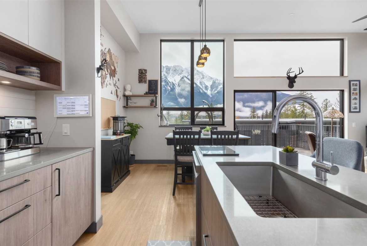 Welcome to Elevate. This spacious end-unit duplex sits in a superior location, offering privacy and unobstructed Mount Currie views. The open, bright main living area flows onto a generous view deck, while the lower level provides flexible space for work, play, or guests. The primary bedroom features a large walk-in closet with barn door and a luxe ensuite. Upgrades include glare reducing window film, solar and remote controlled shades, oak window sills, and a ceiling fan. The kitchen offers an induction oven and newer dishwasher, with a pantry and wine cellar added under the stairs. Additional features include a fenced back patio, EV charger, and upgraded wooden garage shelving. Designed for comfort, storage, and year round living.