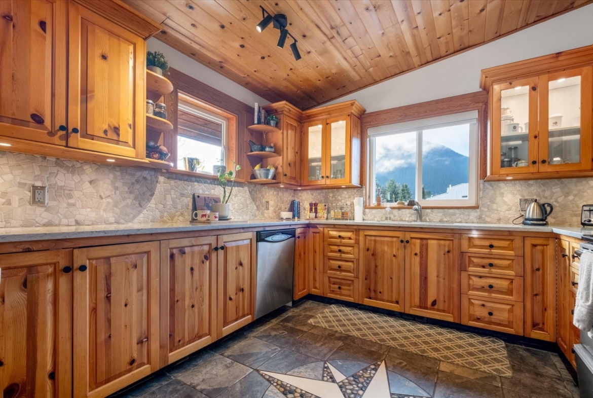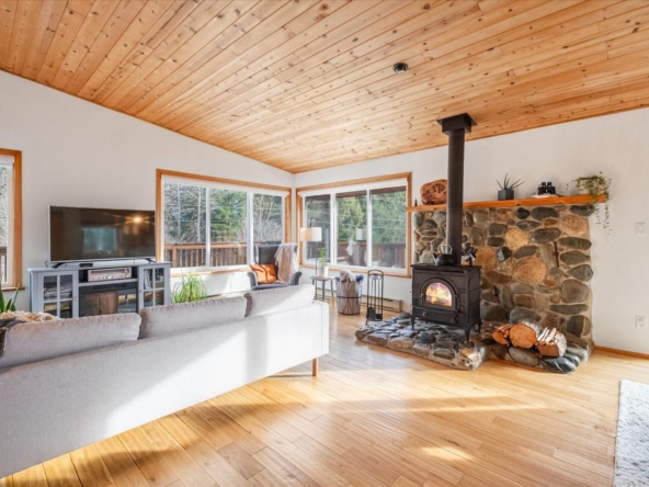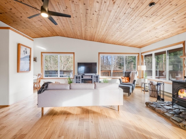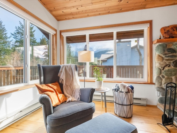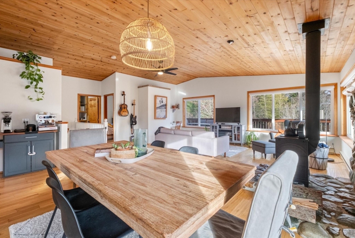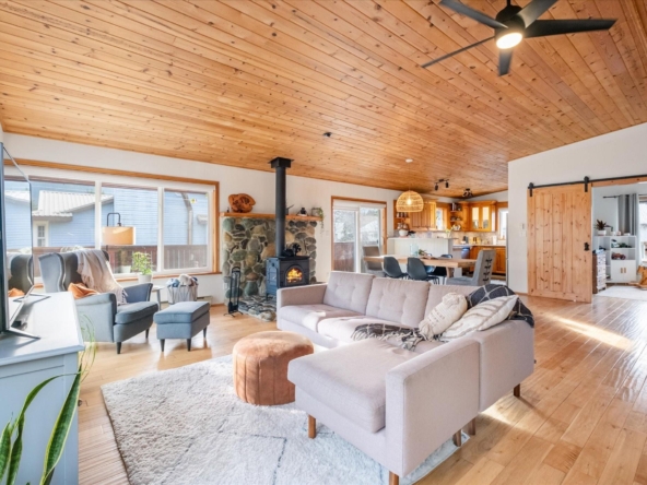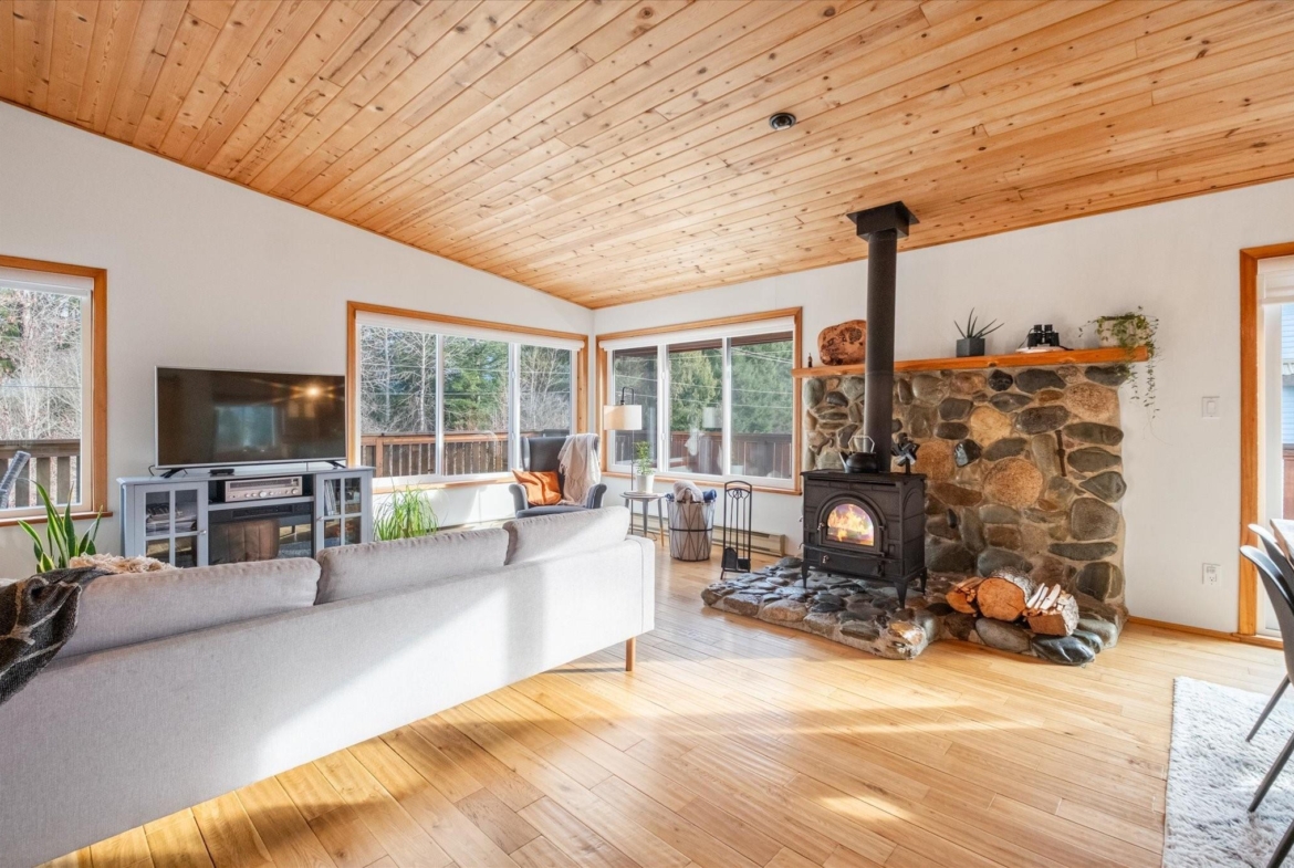 Sunshine, mountain views, and flexible living come together in this Pemberton home on a corner lot with mature trees and established landscaping. The open-concept living area is bright and welcoming, anchored by a cozy wood-burning stove, with some updates already completed.