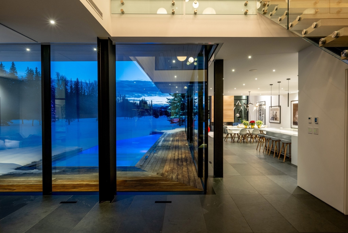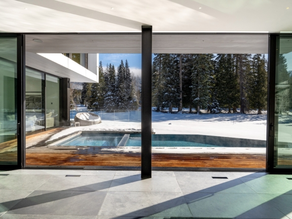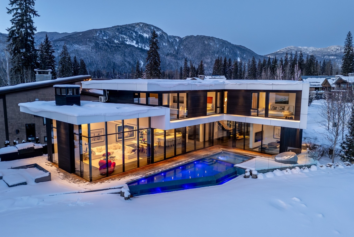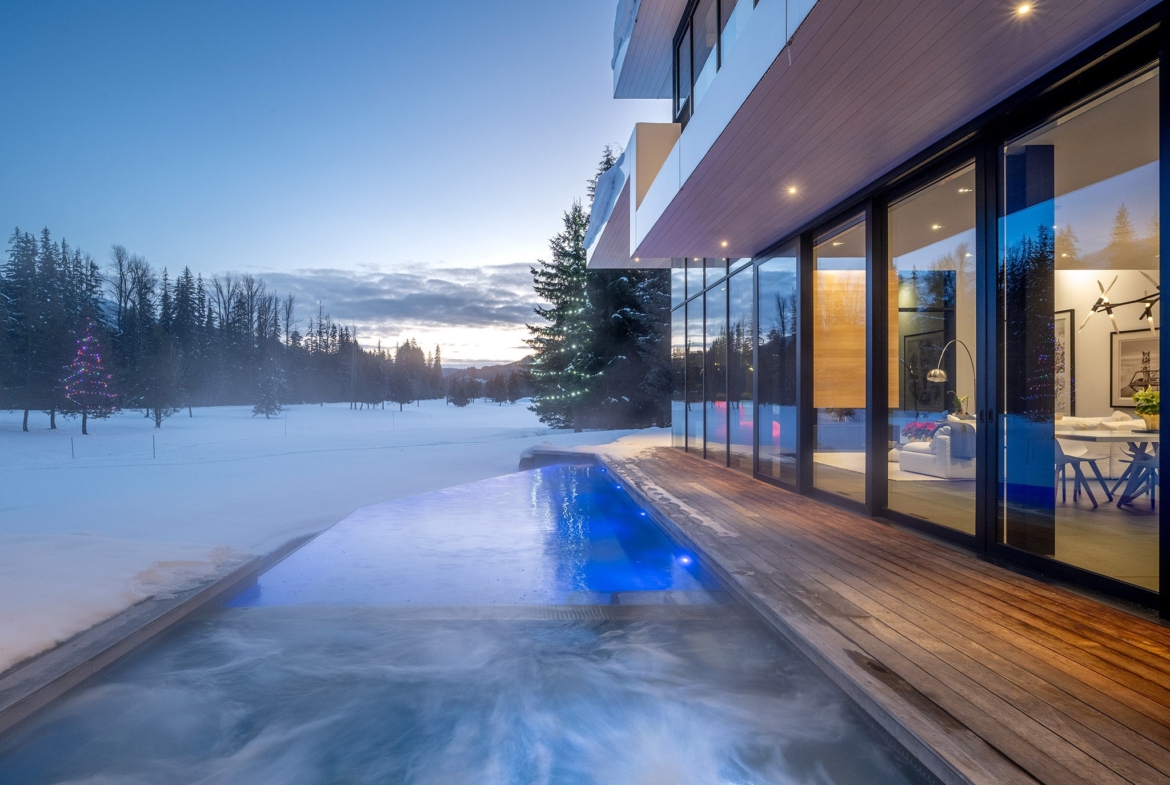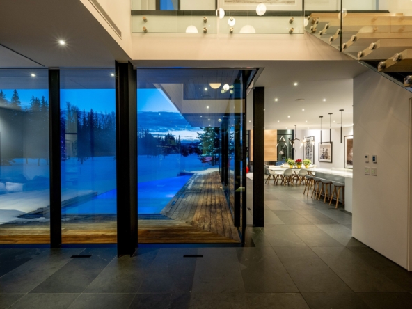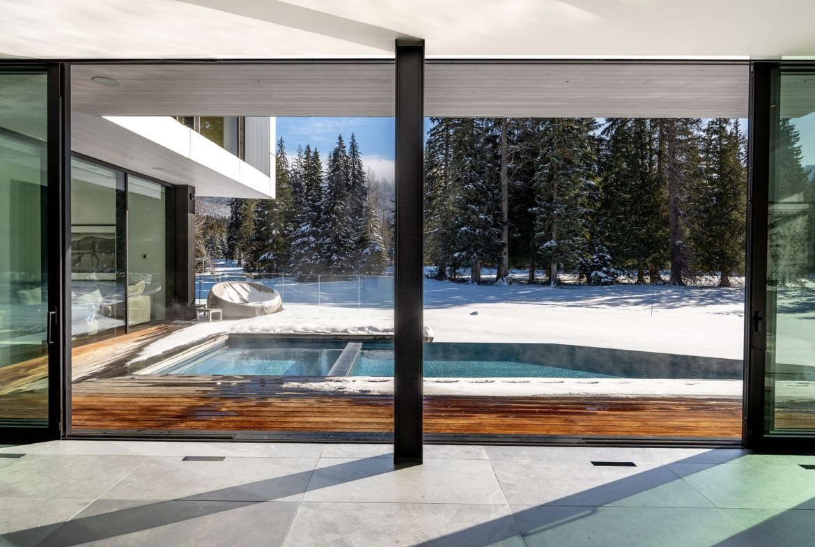 8080 Cypress Place; a breathtaking mid century modern mountain escape that is perfectly positioned on the 3rd hole of Nicklaus North Golf Course – one of North America’s great championship golf courses. Incomparable views are visible throughout. You will never tire of watching the seasons change whether it be from the vast living room or the grand primary suite courtesy of the unbelievable glass that surrounds this luxury home. A gourmet solid oak kitchen featuring a Gaggenau steam oven + 2 dishwashers, Wolf Range and ample storage is an incredible gathering space that lends this to be the perfect home for entertaining groups of all sizes. Walk out from the living room, dining room or kitchen onto the expansive teak deck where you can cool off in your very own pool during the summer months, warm up after a thrilling day on the slopes in the hot tub, or enjoy your favorite glass of wine around the firepit after enjoying a delicious dinner prepared on the outdoor BBQ. All day sun can be enjoyed year round from BOTH the interior and exterior living space. Each bedroom has its own lavish ensuite bathroom featuring Dornbracht fixtures and you will undoubtedly appreciate the handmade wool carpet featured in each bedroom. Noteworthy features that must be mentioned include Vistosi lights in the welcoming Foyer, automated blinds throughout the entire property, full security system – including 4 cameras, 1 inch slate flooring and a wonderful pond just outside the front door. This sensational one of a kind property cannot be duplicated. Absolute quality, spectacular design execution paired with a breathtaking location make 8080 Cypress Place the perfect retreat to come home to, unwind and immerse yourself in the breathtaking surroundings whether it be as your full time home or mountain haven.