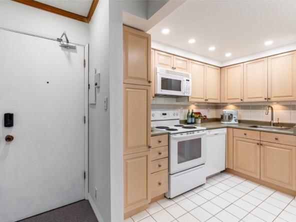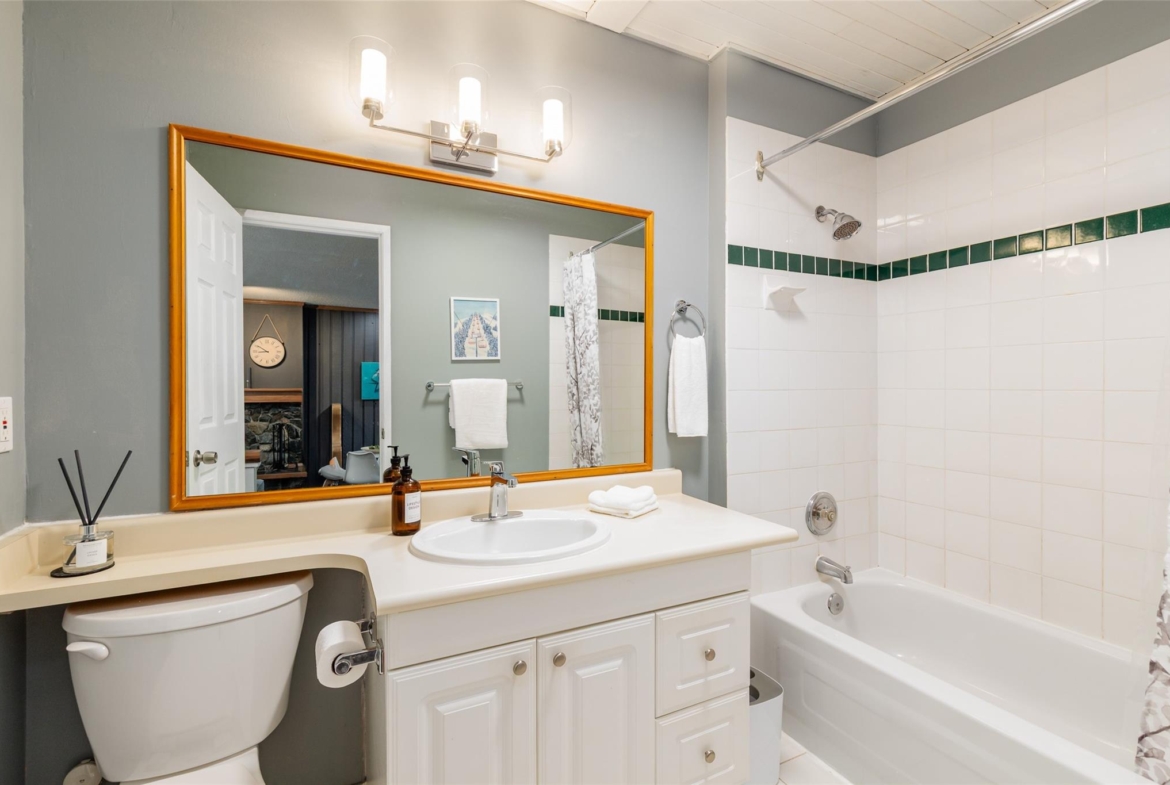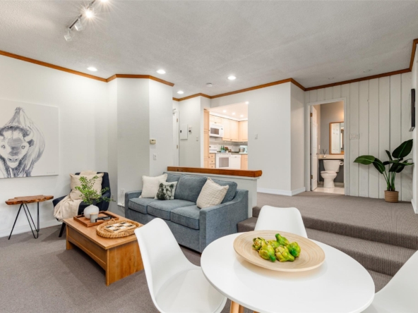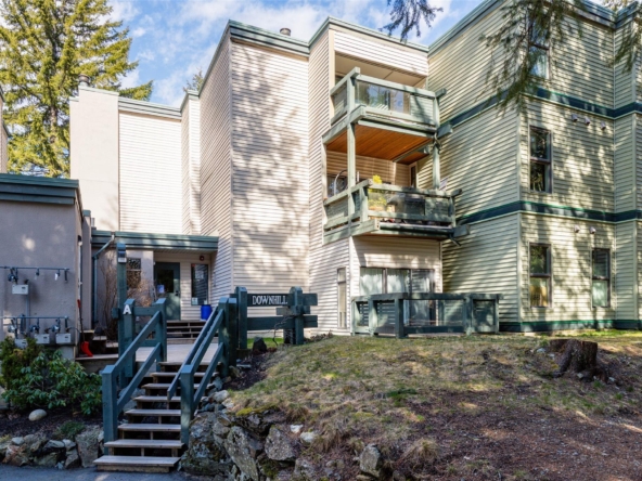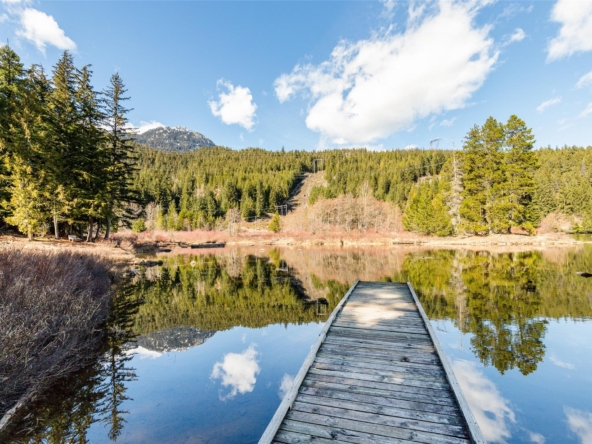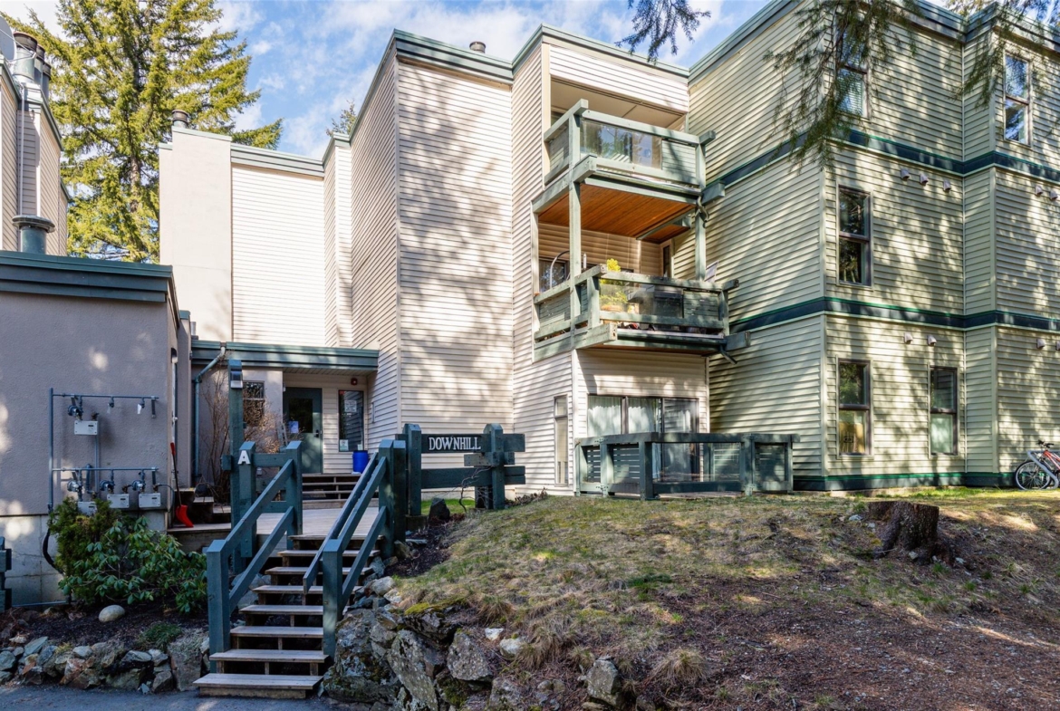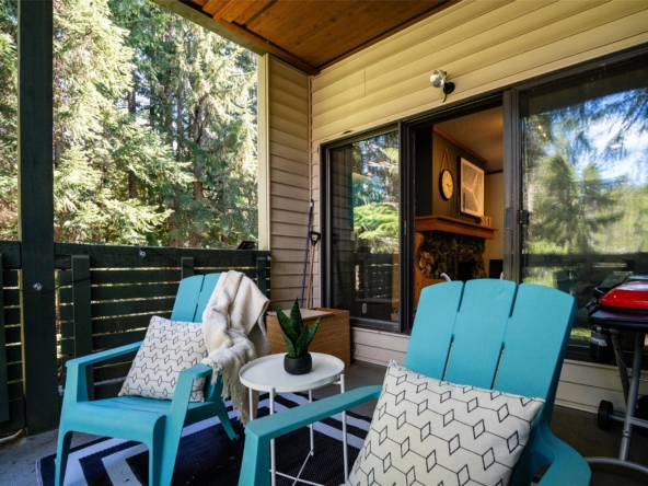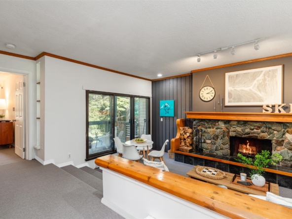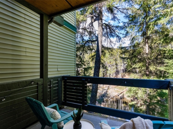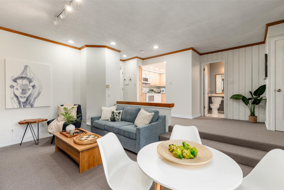 LAKESIDE 1-bed & 1-bath END-UNIT condo at Tamarisk on the shores of Alpha Lake! Recently painted, with new bathroom fixtures, lighting, and new wool carpets. Property features in-suite laundry and a private lakeside balcony on the quiet side of building A and parking for 4 cars! Large floorplan at 699 sq ft comfortably sleeps 4. Cozy wood fireplace is perfect after a day on the slopes! Located on the bus route and Valley Trail to Creekside and Function Junction. Tamarisk features a private dock, clubhouse, private storage unit, kayak storage, and 3 bike storage rooms. Zoned for full-time use and long-term rentals. No GST. Easy to show.